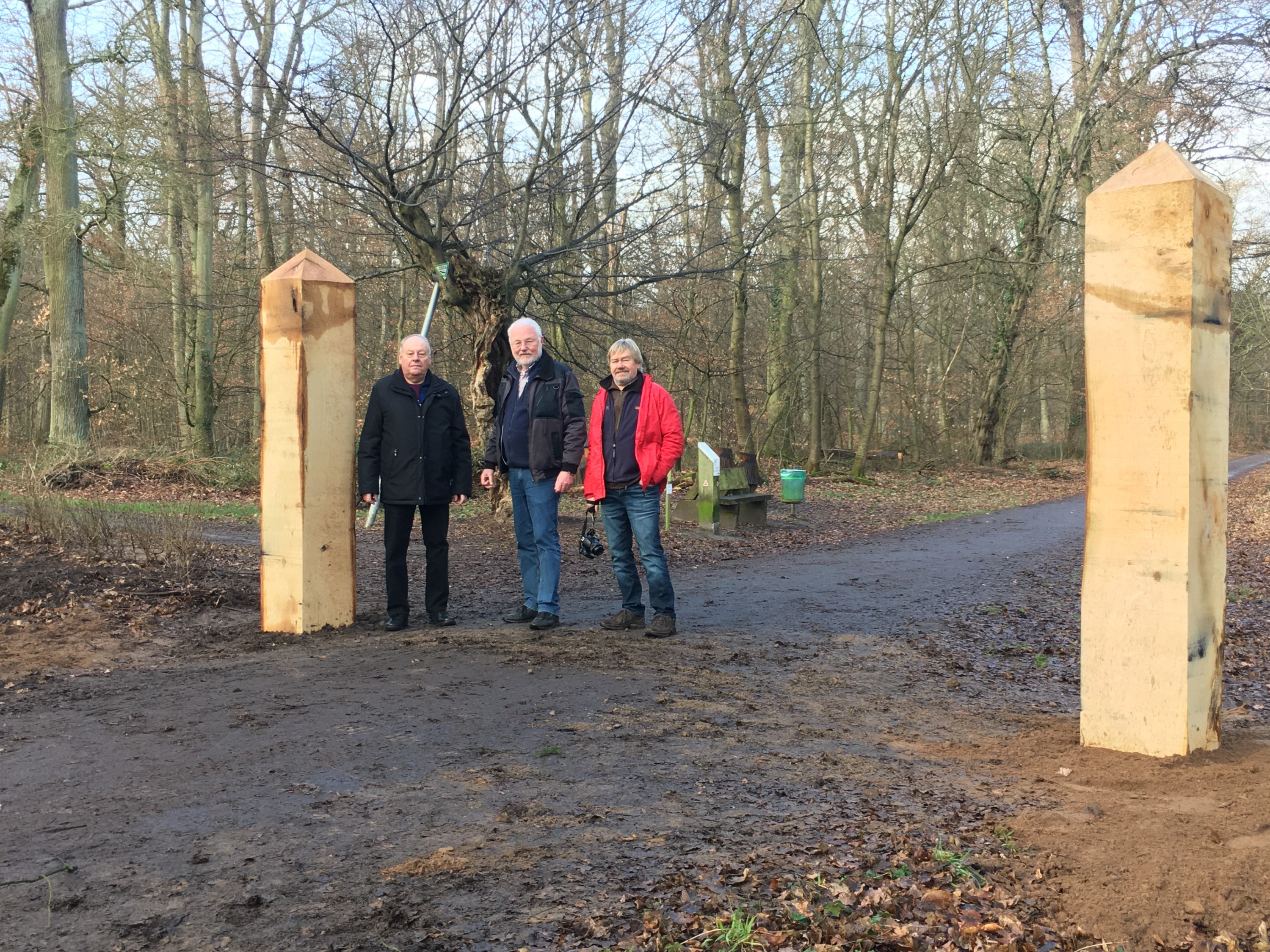 In Kooperation mit der Regionalpark RheinMain Südwest gGmbH und der Stadt Dreieich organisieren und koordinieren die Freunde Sprendlingens die Rekonstruktion der Landwehr an dieser Stelle. Bereits im November letzten Jahres reinigte und vertiefte ein Unternehmen mit einem Spezialbagger den Landwehrgraben. Vorher wurde mit einer archäologischen Untersuchung durch die Untere Denkmalschutzbehörde das Grabenprofil dokumentiert. Im Dezember erfolgte die Anpflanzung einer Weißdornhecke zu beiden Seiten des Grabens. Jetzt stellte eine Gartenbaufirma die Pfosten für den Schlagbaum des Buch-Schlags auf. Es handelt sich um drei Meter, zugespitzte Eichenpfosten mit einem Querschnitt von 40 mal 40 Zentimetern. Das Holz stammt von einer umgestürzten Eiche, die ganz in der Nähe stand. Der Schlagbaum selbst ist bereits bei einer Langener Zimmerei in Arbeit. In einem gemeinsamen Projekt der Geschichtsvereine aus Langen, Dreieichenhain, Sprendlingen, Buchschlag und Neu-Isenburg soll dort der mittlere Abschnitt des DreyEicher Grenzwegs beginnen. Die unter Naturschutz stehende, bizarr geformte Schnaitel-Hainbuche erhöht zudem die Attraktivität dieses Ortes.