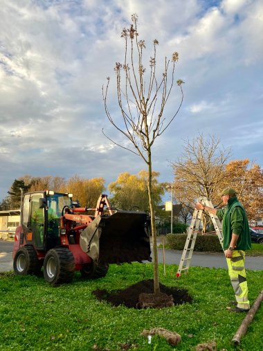 Gepflanzt wurde der bereits fünf Meter hohe Baum unmittelbar vor dem Empfang der DLB-Zentrale. Über das Geschenk freut sich außer den beiden Ersten Stadträten der Städte Dreieich und Neu-Isenburg, Holger Dechert und Stefan Schmitt, auch DLB-Vorständin Petra Klink: „Jetzt haben die Empfangsmitarbeiter auch einen natürlichen Sonnenschutz!“