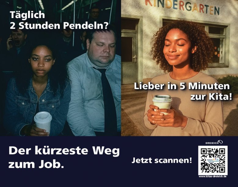 Der Arbeitsmarkt ist leer gefegt, die Konkurrenz im Rhein-Main-Gebiet ist groß. Das Kommunikationsressort hat nun eine breit angelegte Kampagne gestartet, um potenzielle Bewerberinnen und Bewerber auf die Dreieicher Einrichtungen aufmerksam zu machen. Ein Fokus liegt dabei auf in Dreieich wohnhaften Fachkräften, die derzeit außerhalb von Dreieich arbeiten. Einen anderen Schwerpunkt bildet die gezielte Bewerbung der drei durch Anbau oder kompletten Neubau jüngst erweiterten bzw. entstandenen Einrichtungen Zeisigweg, Rückertsweg und Am Lachengraben.