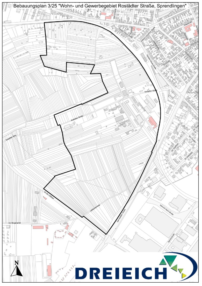 Mit dem Bebauungsplan Nr. 3/25 „Wohn- und Gewerbegebiet Rostädter Straße, Sprendlingen“ soll die Stadtentwicklung Dreieichs wieder Fahrt aufnehmen, denn mögliche Bauflächen sind wichtig für die wirtschaftliche Entwicklung und Sicherung der Wettbewerbsfähigkeit Dreieichs. Wichtiger Teil der Rahmenplanung für das Projekt ist eine detaillierte Auseinandersetzung mit den Möglichkeiten, Wohn- und Gewerbegebiete nachhaltig zu gestalten, wie beispielsweise durch eine naturnahe Flächengestaltung, ein nachhaltiges Energieversorgungskonzept und ein tragfähiges Mobilitätskonzept. Ziel ist es, ein Gebiet zu entwickeln, das die Anforderungen an die Entwicklung von Gewerbe- und Wohnflächen und des Klimaschutzes bestmöglich vereint. Im ersten Schritt soll nun unter Einbeziehung aller bereits erstellten Fachplanungen und den aktuellen Rahmenbedingungen ein städtebauliches Konzept entwickelt werden. Sollten sich dabei zum Beispiel Bereiche und Flächen ergeben, die sich nicht zur Entwicklung eignen, kann der Geltungsbereich des Bebauungsplanes entsprechend reduziert werden. Um bereits im frühen Stadium die Flächenverfügbarkeit für die Durchführung der städtebaulichen Maßnahme mit einzubeziehen, soll zusätzlich eine Vorkaufsrechtssatzung3 beschlossen werden. Um die Vorgaben des aufzustellenden Bebauungsplans und die städtebauliche Entwicklung umzusetzen, wird im späteren Verlauf eine Neuordnung der Grundstücke durch ein Umlegungsverfahren4 notwendig.