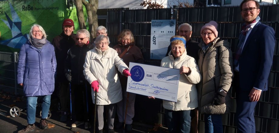 Foto (RaBe) in der Anlage: Zur Eröffnung übergab Jens Prößer (1. von links) die Fördersumme des Dreieicher Weihnachtskalenders an Veronika Martin (1. von rechts) vom Mehrgenerationenhaus RaBe. Die Langsamspaziergangsgruppe weihte den Denkpfad ein und stellte sich den Aufgaben der „Zahlenrunde“.