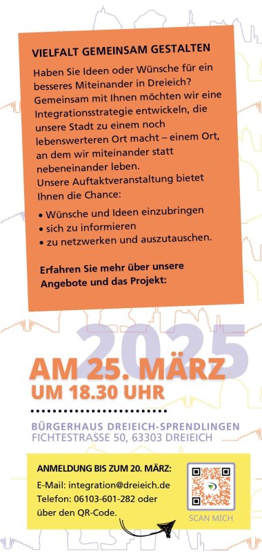 Die Reise startet am 25. März mit einer großen Auftaktveranstaltung im Bürgerhaus Sprendlingen. In diesem Rahmen wird das Projekt vorgestellt, es werden erste Ideen und Anregungen gesammelt, ein Dialog soll angestoßen und das Netzwerk von Aktiven und Interessierten im Bereich Integration und Inklusion gleichermaßen stärker geknüpft werden, um ein vielfältiges Dreieich zu gestalten. Im Anschluss werden weitere Beteiligungsformate entwickelt, die auf die Bedarfe und Perspektiven einzelner Themen zugeschnitten werden: Workshops, digitale Formate, Stadtgespräche und vieles mehr.