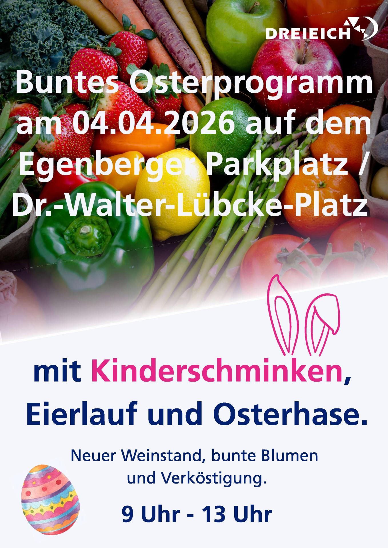 Wer am Ostersamstag zum Wochenmarkt kommt, kann sich auf eine kleine Osterüberraschung freuen, die das Team der Wirtschaftsförderung vor Ort bereithält. Der Verein der Bimmbärn trägt mit kostenlosem Kinderschminken zum bunten Programm bei. Die Standbetreibenden präsentieren sich mit besonderen Backwaren und Leckereien, Kaffee und Kuchen, herzhaften Imbissangeboten „to go“, Feinkost zum Wein, tagesaktuellen Fischangeboten sowie attraktiven Sonderpreisen, etwa auf gemischte Obsttüten.