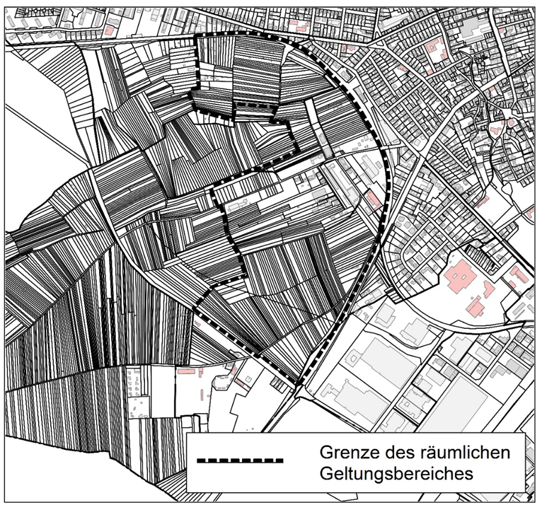 Der räumliche Geltungsbereich des Bebauungsplanes ist auch aus der unten abgebildeten Karte zu ersehen. Bei Abweichungen oder Unvollständigkeiten des Grundstücksverzeichnisses hat die Planzeichnung Vorrang.