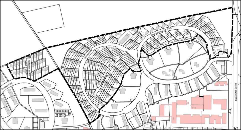Die Stadtverordnetenversammlung der Stadt Dreieich hat in ihrer Sitzung am 23. September 2025 den Beschluss gefasst, dass für den Bereich der Grundstücke der Reihenhäuser und Bungalows in der Rostocker Straße, im Sudetenring, im Kurt-Schumacher-Ring und der Ketteler Straße und einiger flankierender Grundstücke zur Sicherung der geordneten städtebaulichen Entwicklung ein Bebauungsplan nach § 2 Abs. 1 BauGB im Regelverfahren gem. der §§ 1-4c und 8-10a BauGB aufgestellt wird.